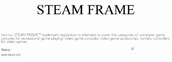 美国专利商标局近日公布了V社提交的两份商标申请,新商标名称为“Steam Frame”,其中一项涉及“娱乐用游戏主机”及相关外设和控制器。
