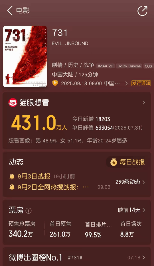 📈 **强劲的市场表现与排片优势**: 距离9月18日上映还有14天,《731》的预售热度已持续走高,预售总票房突破340万元,其中首日预售票房高达261万元。更值得关注的是,影片首日排片占比高达99.5%,预计将有8.8万场次在全国范围内同步上映,这充分体现了市场对其的高度认可和期待。