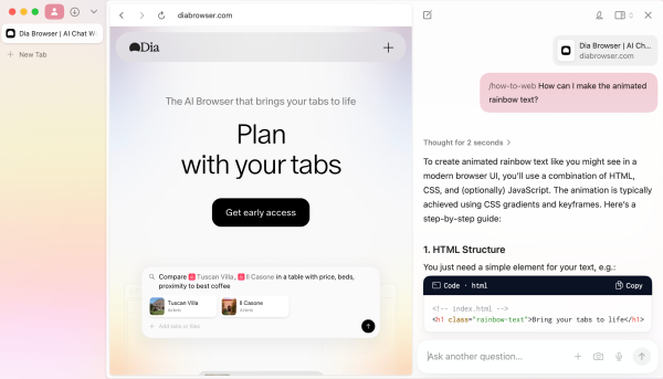 Atlassian共同創辦人暨執行長Mike Cannon-Brookes表示,現代的瀏覽器通常是為了瀏覽而非工作而設計的,他們想讓Dia成為知識工作者的瀏覽器,針對SaaS應用進行最佳化,內含各種AI技能與工作記憶,同時具備信任與安全。