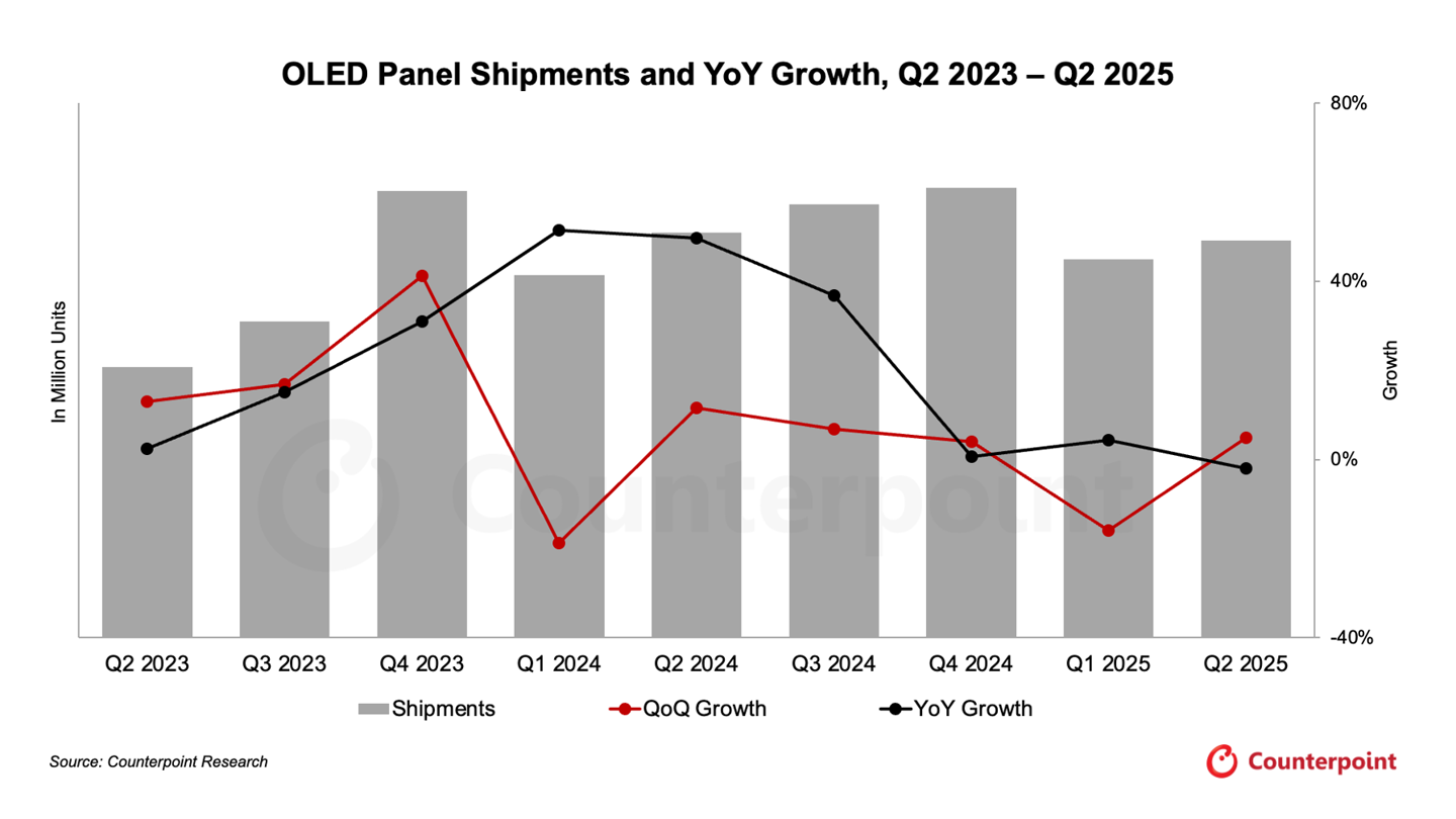 2025年第二季度全球OLED面板出货量较去年同期下降2%,但环比增长5%。相比之下,第一季度的出货量同比增长4%,但环比下降16%。