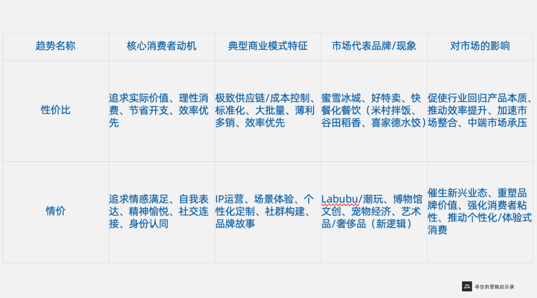 这种看似分裂的消费图景,指向了当下中国市场并行不悖的两大商业模式——性价比与情价比。