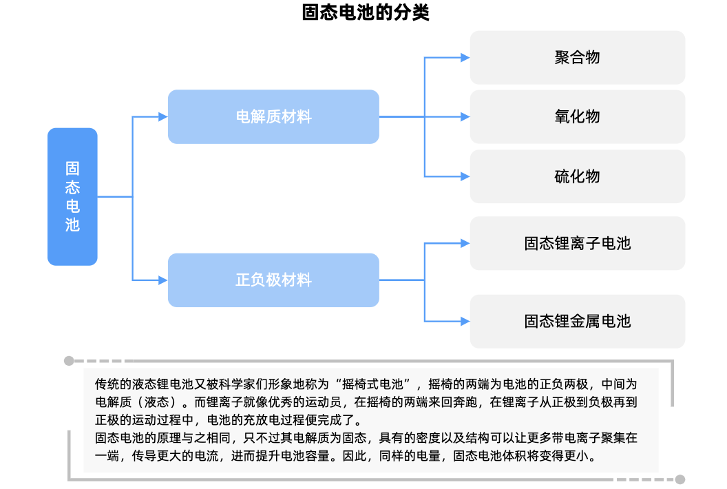 固态电池的核心在于使用固态电解质替代传统锂离子电池中的液态电解液。相比液体电解质,固体电解质不挥发一般不可燃,在安全性和能量密度方面更具优势显著。