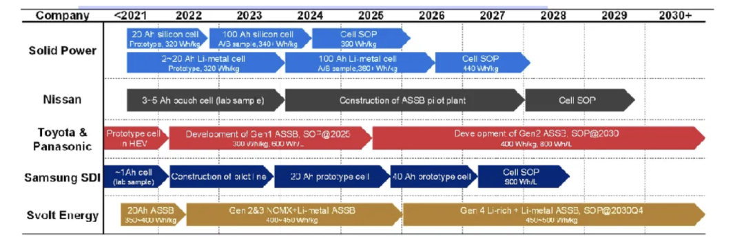 政策加码下,宁德时代、国轩高科、卫蓝新能源、亿纬锂能、比亚迪、清陶能源(与上汽合作)等头部电池厂/车厂均将量产时间定于 2027-2030年间,电池能量 密度目标在 400Wh/kg 左右。