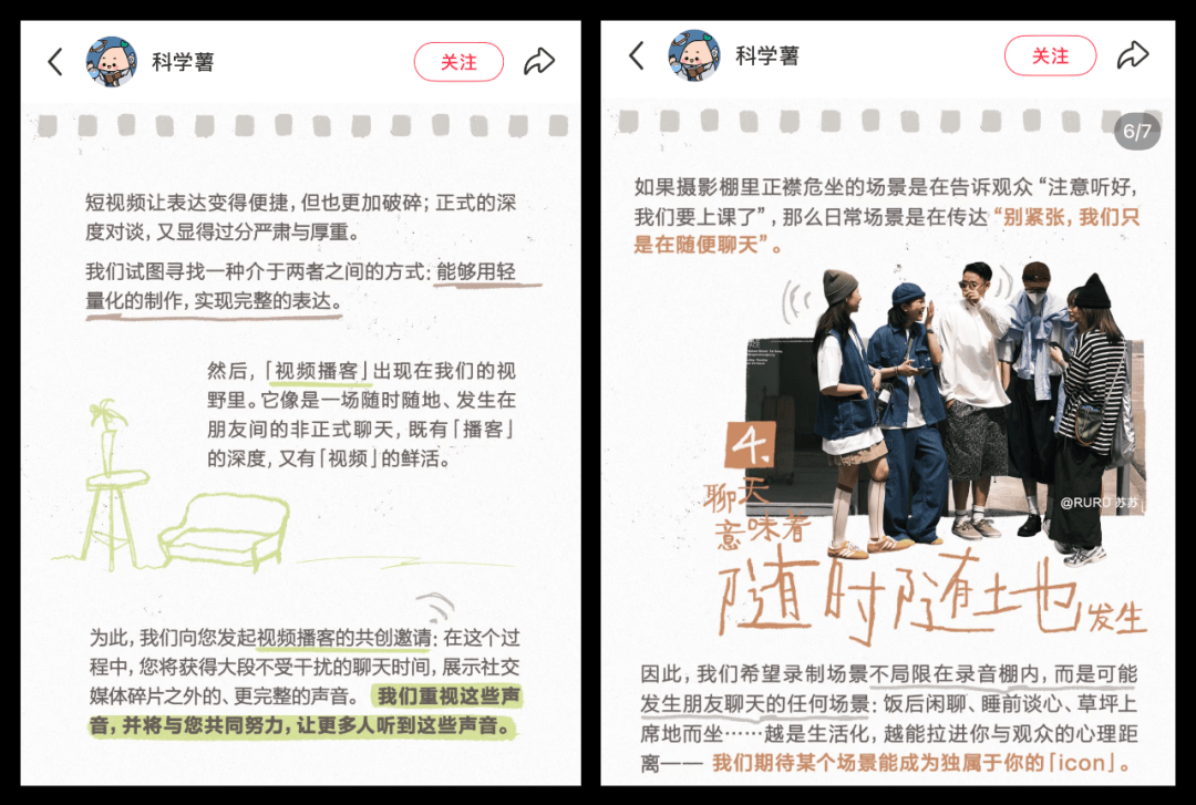 小红书的优势有二,一是社区用户与中文播客用户重合度极高,二是内容创作人才众多。这次「随时随地视频播客」扶持计划下尽皆都是素人创作者自制的高质量视频内容,平台也特别强调「小红书的视频播客就是朋友聊天」的低门槛创作环境。如果后续小红书也效仿B站邀到更多名人主播进场,小红书的视频播客生态可以说是未来可期。