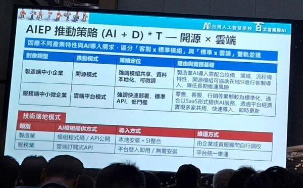 在技術面上,蔡明順指出,先依照產業的性質區分製造業與非製造業,瓦製造端的中小型企業,他建議採用開源模式,強調模組共享、資料本地化、可微調,需要SI客製化導入及協助維運;至於非製造業類型,即服務端中小微企業,為快速導入、降低門檻,他建議可採用雲端SaaS,例如產、銷、人、發、財開始,「使用就緒的AI服務,先從企業裡找到好的切入點,帶動前進的力量,否則只是口頭上的願景,沒有實際落地的解決方案」