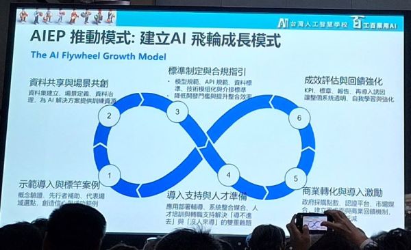 蔡明順指出,AIEP的6個步驟可形成內外循環的飛輪成長模式,企業可運用6個目標建立內部的檢核機制,而外循環也能運用6個目標建立生態系。另外,AIEP也參考新加坡的AIRI(Readiness Index),AIEP的6個目標可對應AIRI的6個模式,先推動技術和認知的成熟度後,再大力推動AI,代表任何社會發展AI需經歷的階段與痛點。