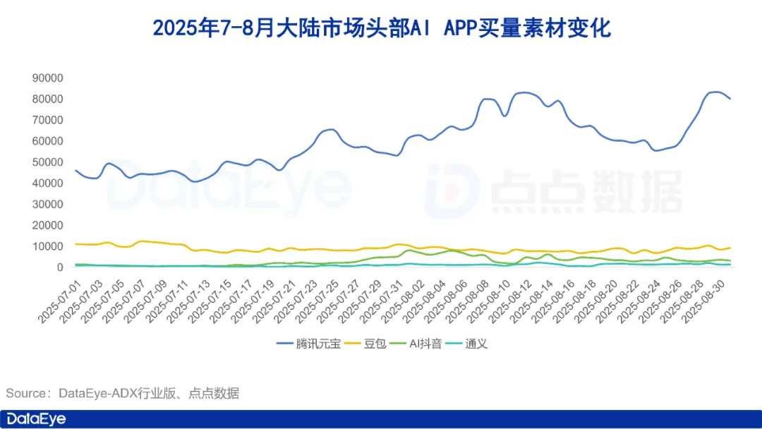 ADX行业版数据显示,2025年8月,大陆市场头部AI APP买量素材呈明显分化格局,腾讯元宝投放素材量持续走高,豆包、AI抖音与通义保持相对较低水平。