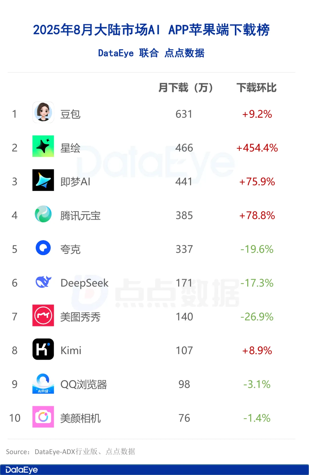 值得注意的是,7月份位列第五位的DeepSeek跌出了8月份TOP 5,取而代之的是字节旗下星绘跻身8月份第二位,下载量占比达14%。
