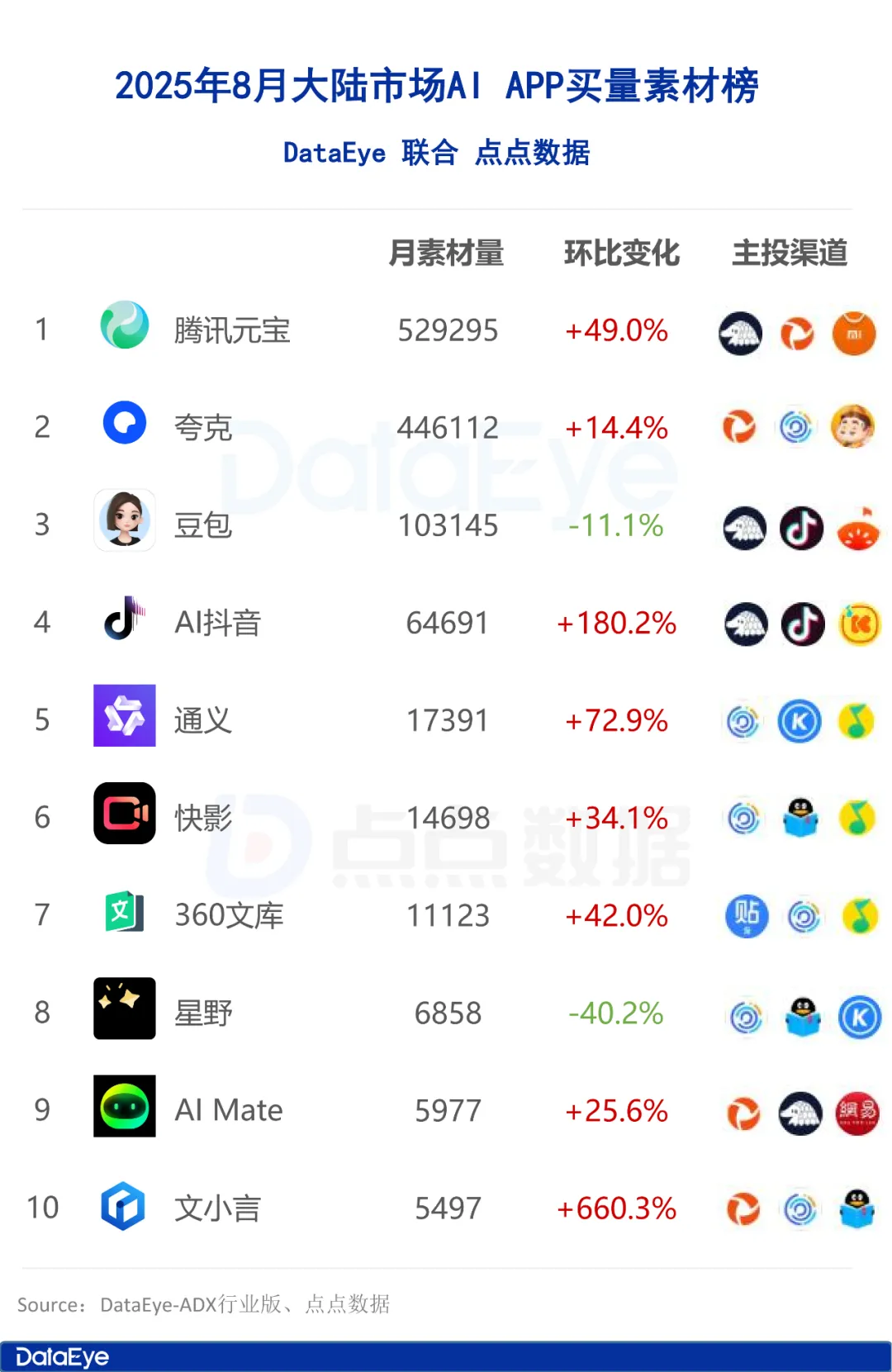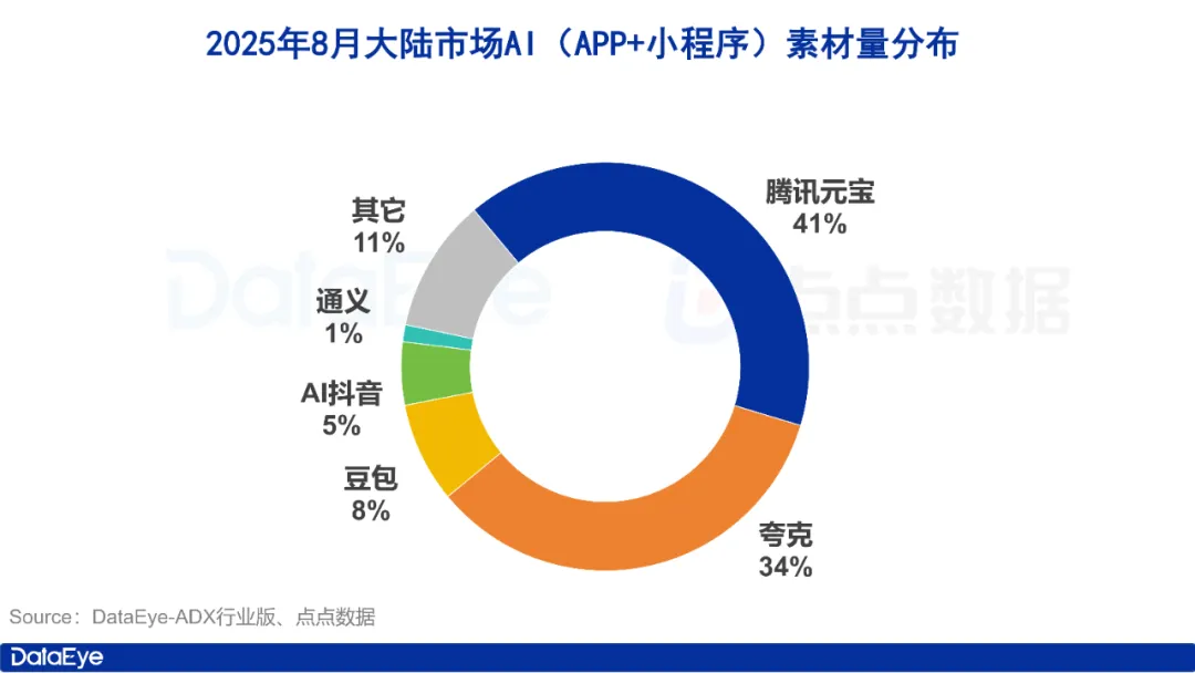 其中,腾讯元宝、夸克、豆包、AI抖音与通义位列素材投放榜TOP 5,这5款应用占据了大陆市场AI行业月投放素材量的89%。