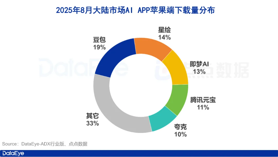 其中,豆包、星绘、即梦AI、腾讯元宝和夸克位列TOP 5,占据了大盘的67%。
