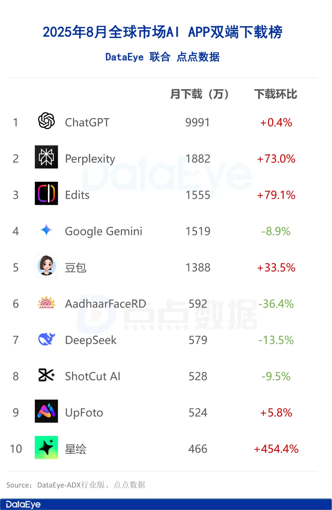 同时,Google Gemini和豆包分别由7月份第二和第四滑落至8月份第四和第五位,Perplexity则由7月份第三晋升至8月份第二位,7月份位列第五的AadhaarFaceRD跌出8月份TOP 5,取而代之的是Instagram推出的Edits跻身8月份第三位。