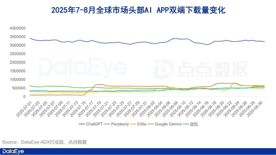 点点数据显示,2025年7月至8月,全球市场头部AI APP双端预估下载量,除ChatGPT依旧遥遥领先外,其余几款产品下载量差距逐步缩小。