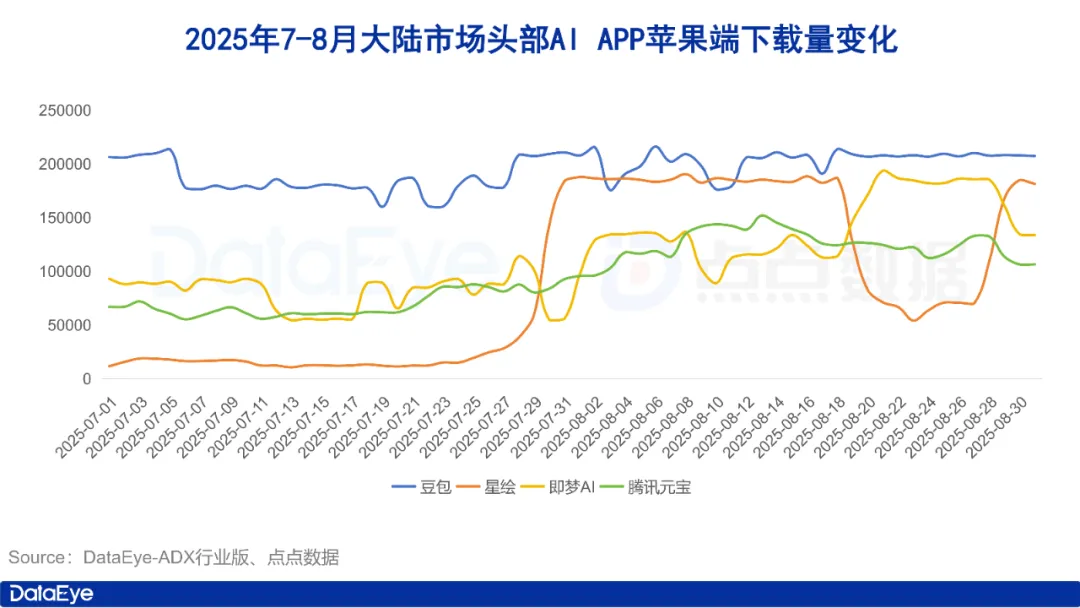 具体来看,豆包下载量始终维持在20万次左右,没有太大波动;星绘下载量提升明显,7月底之前,星绘日下载量多维持在1.5万次左右,7月底开始迅速攀升,并稳定在18万次左右,8月19日开始下滑,至8月底再度回升,期间日下载量约7万次,至月底再度回升至18万次左右。