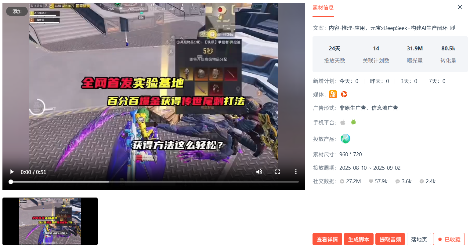 本条素材是腾讯元宝在2025年8月份的新增高曝光视频素材,曝光量3190万,转化量8.05万。