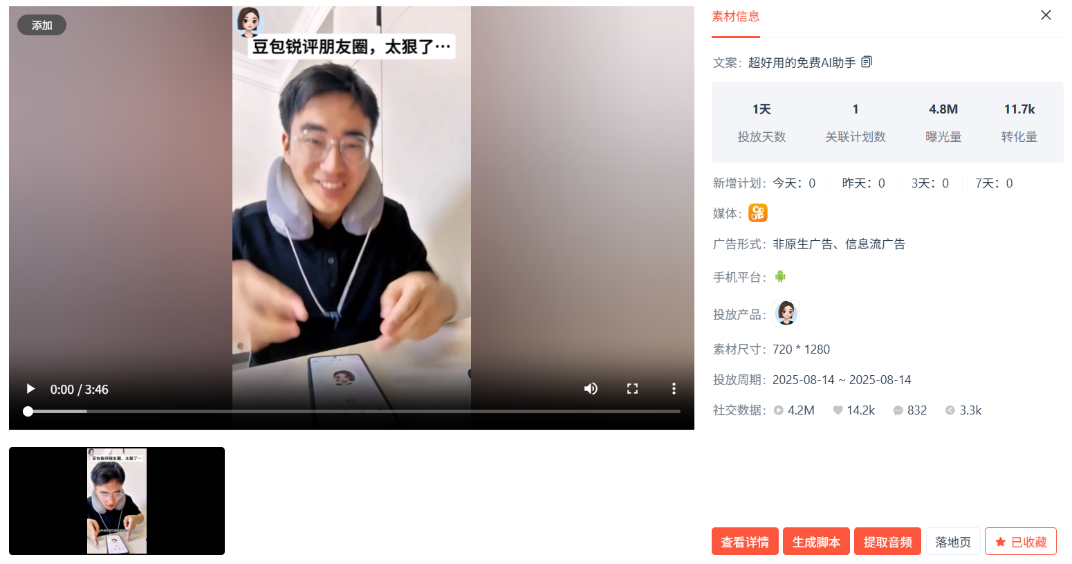 本条素材是豆包在2025年8月份的新增高曝光视频素材,曝光量480万,转化量1.17万。
