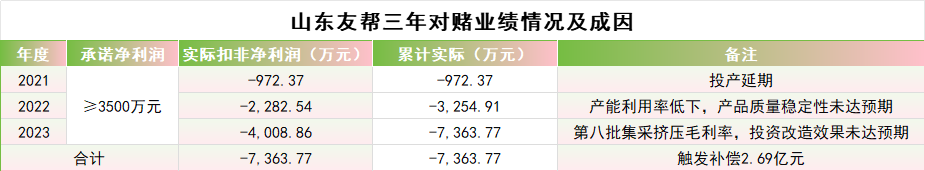 2021-2023年间,山东友帮实际累计亏损高达7363.77万元,未能完成业绩承诺目标,直接触发《股权转让协议》中的业绩补偿条款。