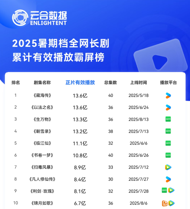 暑期档三大平台的竞争中,爱奇艺保持着领先半步的势头。云合长剧累计有效播放量排行榜前五中,《生万物》《朝雪录》《临江仙》均为爱奇艺独播剧,排名前十中也有四部爱奇艺独播剧、一部爱腾联播剧,市场表现确实略胜一筹。
