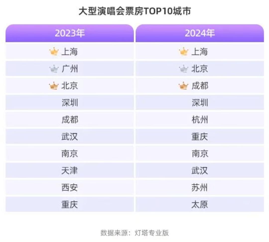 向好的增势不变,但增长的格局变了。根据《报告》统计,去年,上海、北京、成都、深圳和杭州分居大型演唱会票房前十城市,其中,杭州增长尤为明显,从2023年十名开外一跃升至第五。杭州文广旅局发布的数据显示,去年杭州演唱会、音乐节演出场次同比大增470.37%,票房收入同比增长480.9%。