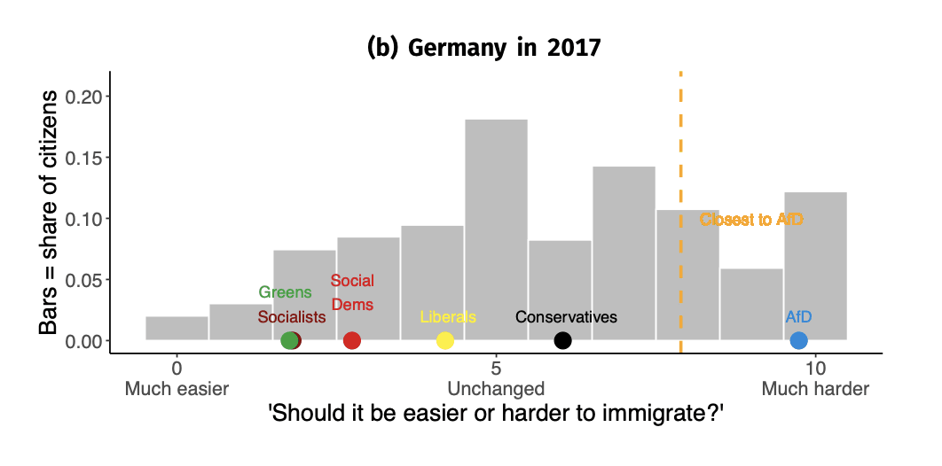 The grey bars represent voters’ attitude towards immigration. Vast majority of voters feel that immigration should be made harder. Yet, all political parties, including the conservative CDU, believe that immigration should be made easier.