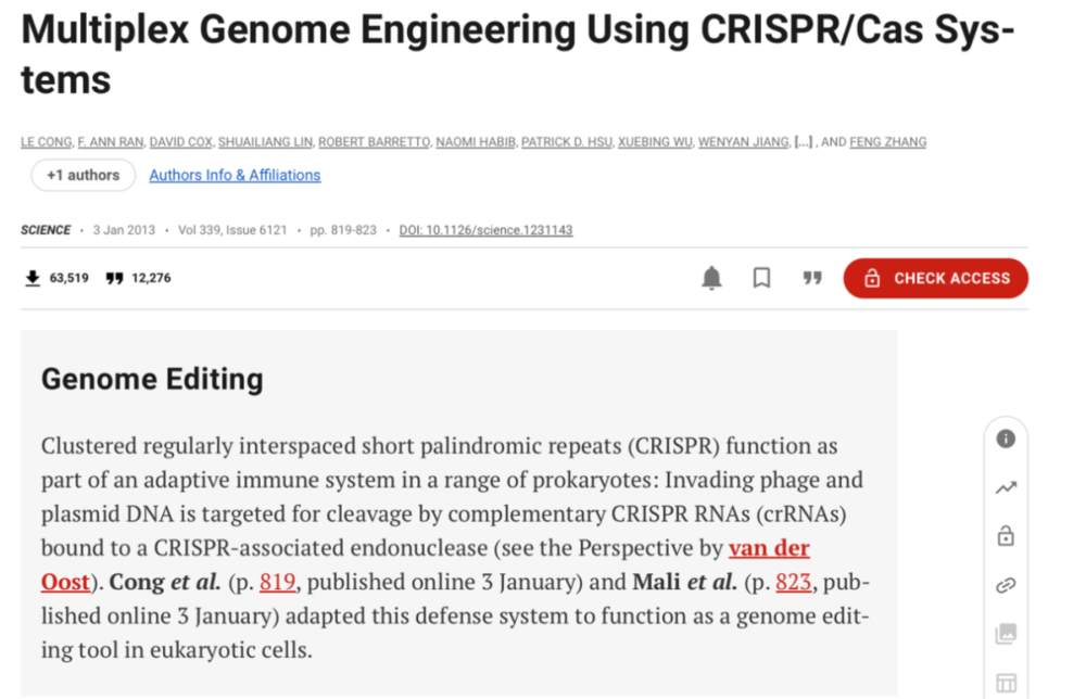 基因编辑在2020年获得了诺贝尔奖,而它的专利之争至今仍在学术界与资本圈掀起波澜。但要追溯基因编辑技术真正走向里程碑的时刻,很多人都会提到 2013 年发表在 Science 上的一篇论文——《Multiplex Genome Engineering Using CRISPR/Cas Systems》。正是这篇论文把 CRISPR-Cas9 从实验室的概念,推向了在哺乳动物细胞中的应用。