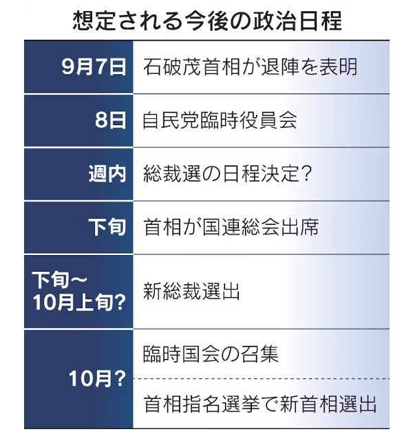 有专家推测,石破提出辞任后,或许将会在这周内决定总裁选举的日程,10月上旬前选出新总裁,10月内选出日本新首相。