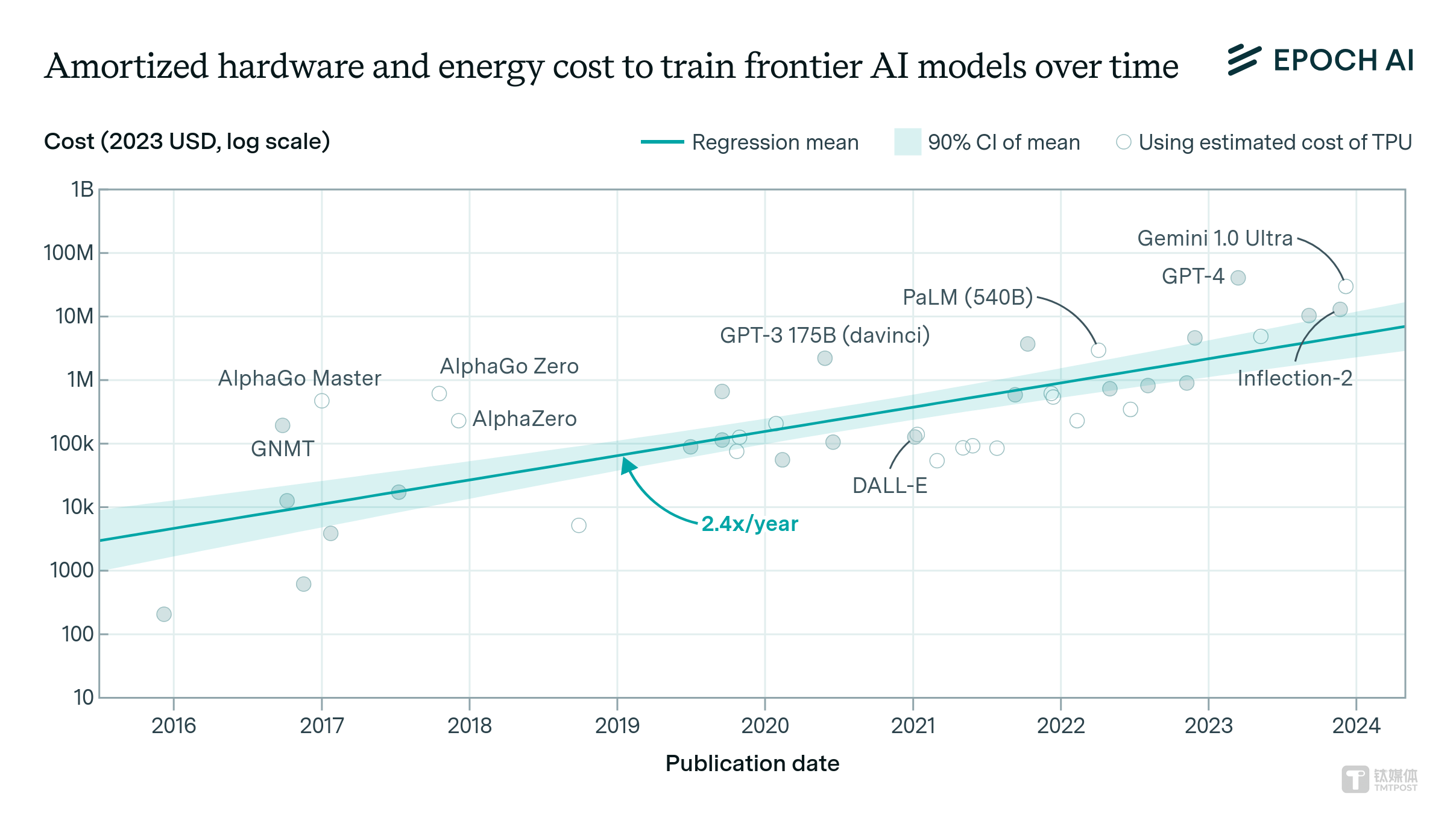 公开数据显示,自2016年以来的8年间,训练前沿AI模型的成本每年增长2到3倍(平均是2.4倍),这意味着,预计到2027年,规模最大的模型成本将超过10亿美元。