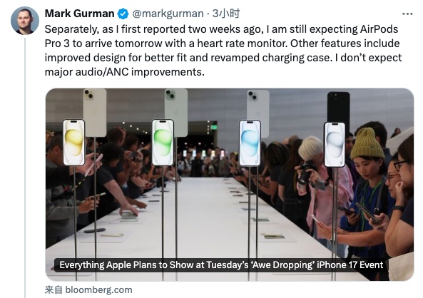 彭博社的马克·古尔曼(Mark Gurman)今天在 X 上发文曝料,称在北京时间明日凌晨 1 点举办的“前方超燃”(Awe Dropping)主题活动中,苹果将会推出 AirPods Pro 3,但后者不会显著提升其主动降噪(ANC)与音质。