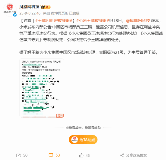 2025年9月8日,小米集团职业道德委员会发布内部邮件,公布了对中国区市场部员工王腾的处理决定。