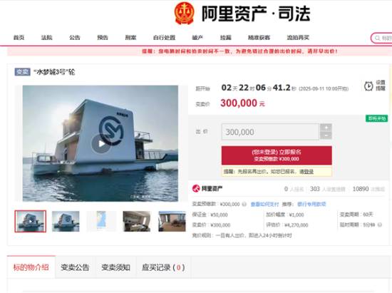 一艘名为“水梦城3号”的超大型游艇近日在阿里拍卖平台以30万元的价格进行变卖,远低于其427万元的评估价。该游艇建造于2020年,因被扣押于2023年10月停止使用,目前停泊在惠州海域。此前该游艇已历经多次拍卖均未成交。工作人员表示,该游艇缺乏动力系统和必要证件,已无法作为普通船舶使用,更适合作为水上建筑用于酒店等用途。此次是其最后一次变卖机会,若仍流拍,将以物抵债。