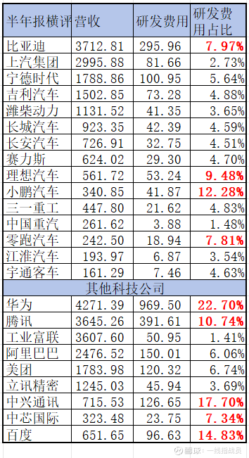 今年上半年,比亚迪这个研发费用占营收的比例,在汽车行业显得异常的高。只有新势力三级的研发投入占比,接近或者超过比亚迪,零跑是因为大量的新车研发。理想,小鹏则是发力ai。但是新势力的规模比较还比较小,研发的绝对投入跟比亚迪还差一个数量级。