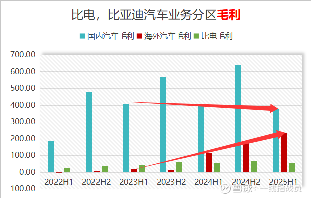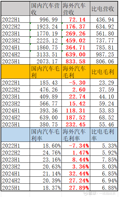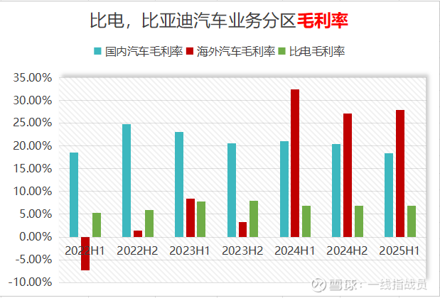 再看毛利率的情况。今年上半年比亚迪海外汽车业务的毛利率是27.89%,比国内汽车业务毛利率,高了9.52个百分点。