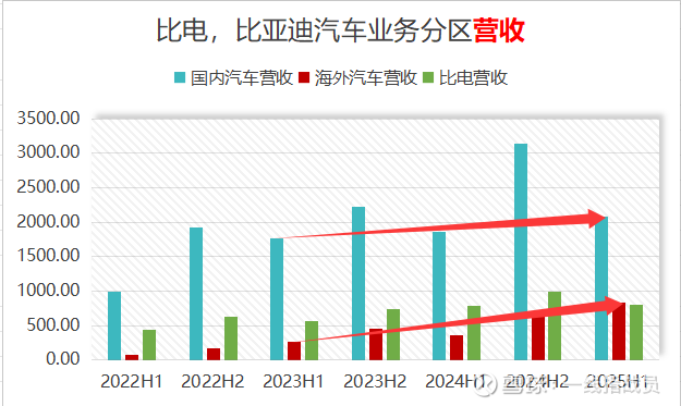 再来看比亚迪的运营情况。把比亚迪的营收分为三大板块,国内汽车业务,海外汽车业务,比电业务。