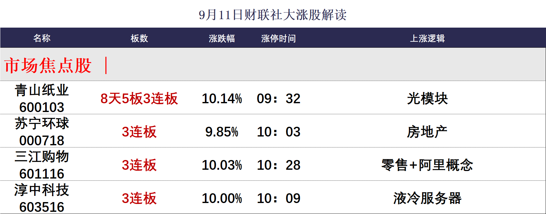 【9月11日涨停分析】今日共87股涨停,连板股总数11只,14股封板未遂,封板率为86%(不含ST股、退市股)。焦点股方面,天普股份再度停牌核查,首开股份尾盘炸板,市场连板高度降至3连板,其中青山纸业走出8天5板晋级3连板,阿里概念股三江购物3连板,液冷服务器概念股淳中科技3连板。