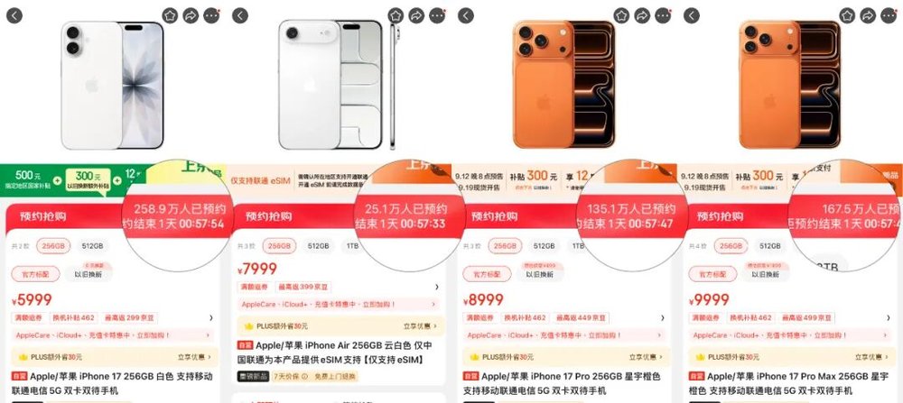 其中,iPhone 17标准版的预约量接近250万一马当先,其次是最大杯的iPhone 17 Pro Max与iPhone 17 Pro,而发布会前的顶流iPhone Air则只有25万——也算是一次标志性的高开低走了。