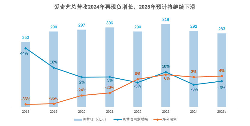 中国在线视频行业正遭遇一场寒意十足的“寒冬”。即便是爱奇艺、芒果tv这样的头部平台,也深陷增长放缓甚至下滑的困局。财报数据显示,曾在2023年迎来营收回暖的爱奇艺,2024年再度掉头向下,营收降至292亿元,2025年预计继续下滑至283亿元左右。