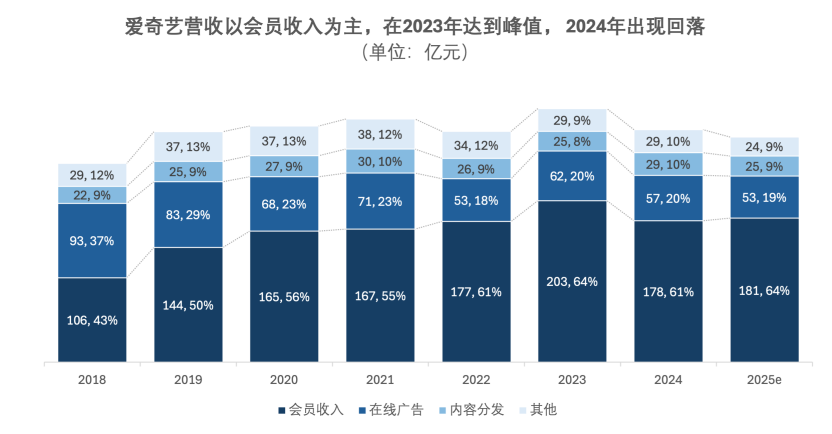 在多元营收探索路径中,会员服务正逐渐扛起“大旗”,成为视频平台营收的核心支柱。分平台来看,爱奇艺的营收结构最稳定,会员服务一直是其最核心的收入来源,占比超六成,2023年更是创下203亿元的历年新高。