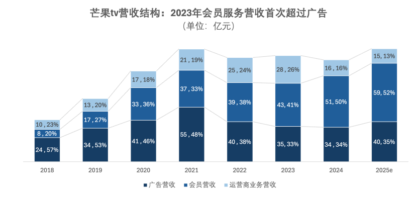 芒果tv的会员业务则实现了“逆袭”,2023年会员营收首次超过广告,成为第一大营收板块,占比超过四成,2024年占比进一步扩大至50%,2025年有望贡献过半收入。