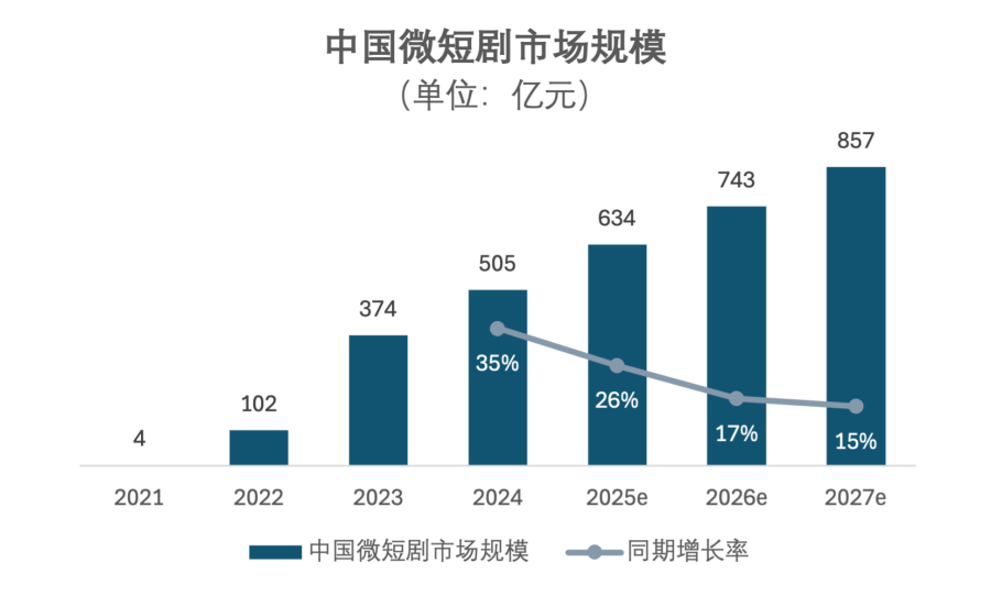 《2024年中国微短剧产业研究报告》显示,中国微短剧的市场规模在快速增长,从2021年3.68亿元攀升至2024年505亿元 。这一数字历史性地超过了同年425亿元的中国电影票房,显示出其强劲的发展势头 。据报告测算,微短剧市场仍将快速增长,2025年市场规模将达到634.3亿元,2027年达到856.5亿元,年复合增长率达到19.2%。