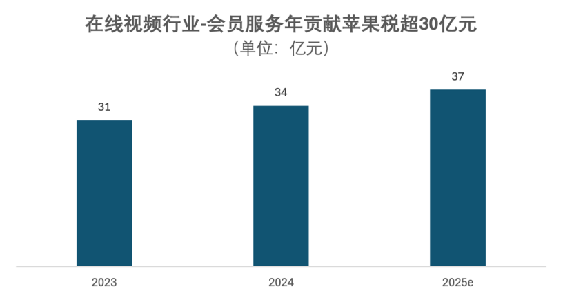 由此推算,2025年整个在线视频行业会员服务业务的苹果税金额,预计增长至37亿元。