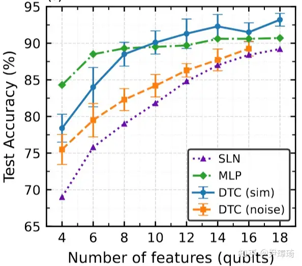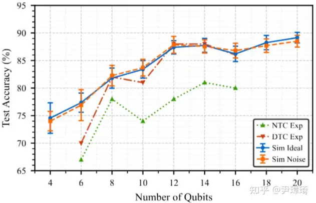 既然在量子线路中,噪声不可避免,有没有什么办法可以消除其效果呢?2022 年,美国谷歌公司利用量子计算机模拟实现了多体局域化离散量子时间晶体,不仅对初态信息具有拓扑保护特性,同时还有足够的非线性与记忆效应。由此我们猜测,利用它来做量子储备池计算,不仅可以抵抗噪声影响,还能高效地完成机器学习任务。于是我们基于离散量子时间晶体,发展了可以在通用量子计算机上运行的量子储备池计算算法。为验证其对噪声的稳定性,我们模拟了含噪声的量子时间晶体储备池算法,并用于 MNIST 的手写字体 10 分类任务。如下图所示,数值模拟清晰表明,在目前保真度 99% 左右的量子门参数下,分类准确率相比无噪声系统的准确率几乎没有下降。随着量子比特数从 4 增加到 18,识别成功率一直在上升,且与 4 层的全连接神经网络的识别效果基本上一致。最高识别成功率在 90% 附近。