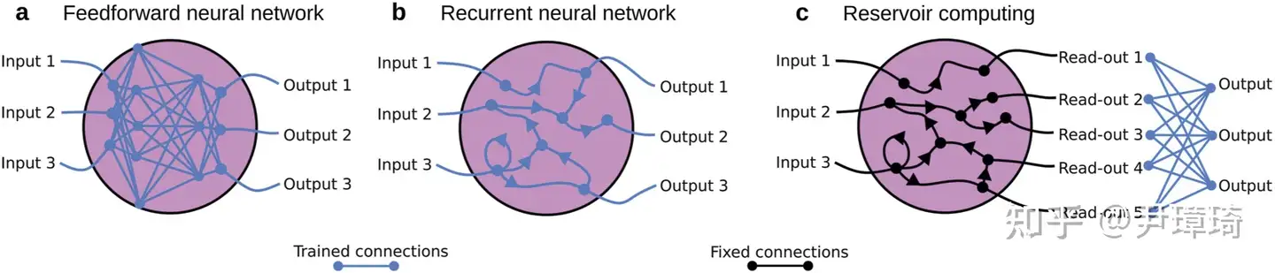 既然量子机器学习中线路调参有这么多问题,可不可以不调参呢?还真是有。如上图所示,在典型的机器学习中,包括前馈神经网络,它具有单向非循环且可训练前馈连接;循环神经网络,它具有可训练的反馈和循环连接;以及储备池计算,它无需训练,只需对输入和输出结果进行线性回归拟合即可。储备池计算,基于稀疏且巨大的变换矩阵,可以代替需要调参经典神经元网络。储备池计算最神奇的地方在于,中间层稀疏矩阵只需在初始时随机生成,计算过程中无需进行调整训练。受到储备池计算的启发,人们提出了量子储备池计算。量子储备池计算,继承了经典储备池计算无需训练的优势,同时由于量子动力学系统天然的非线性,以及量子多体系统维度随着量子比特数指数递增的特性,它相比经典储备池计算更有潜力。在量子储备池计算框架下,并不需要对参数进行精准调控,因此尤其适用于目前中尺度含噪声量子计算系统。