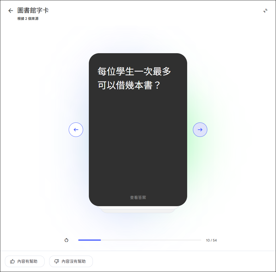 在最近的更新中,可以根據所選的資料來源內容,建立閃卡顯示方式的學習卡。使用者可以自訂學習卡的內容,例如卡片數量和內容的難易度。還可以指定來源範圍、特定主題等。