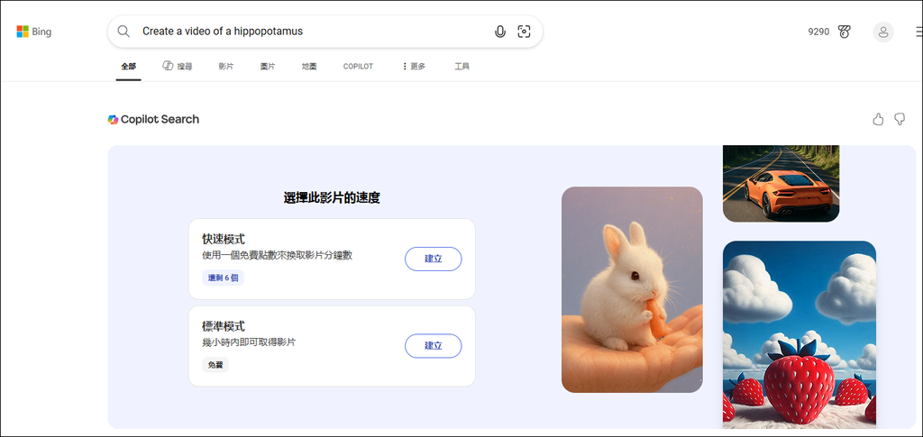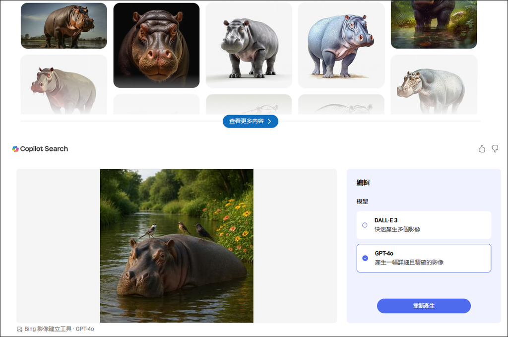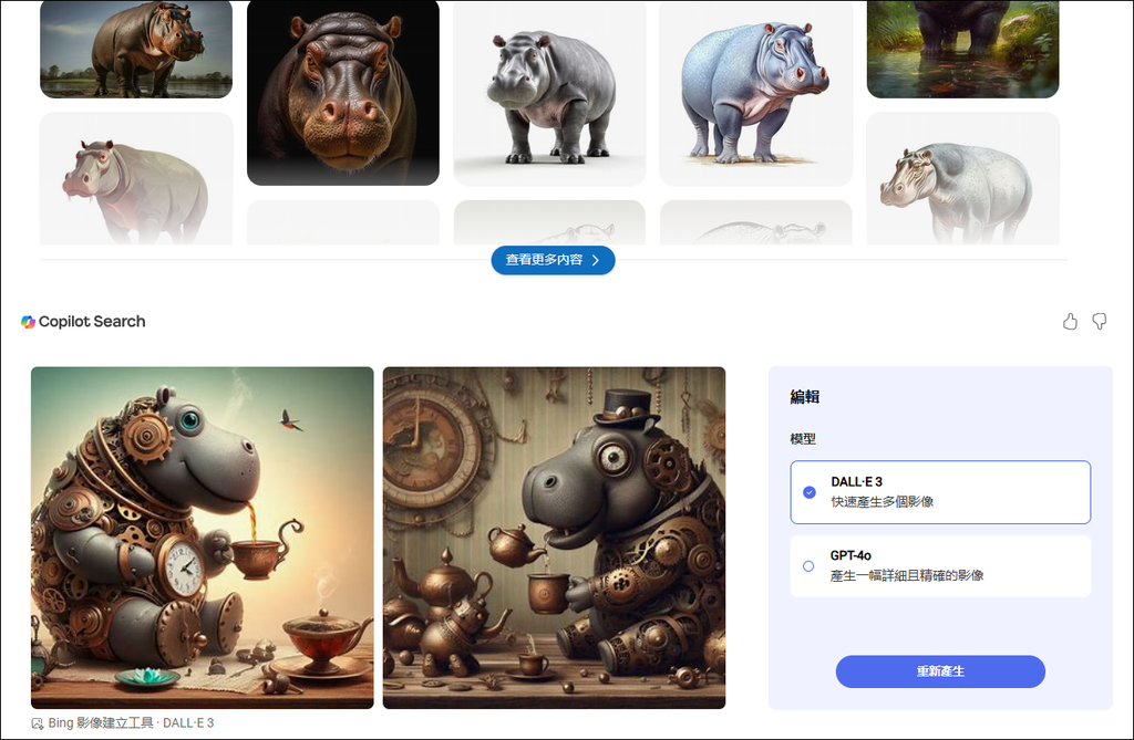 除了會搜尋河馬的圖像之外,也主動以 DALLE-3 模型建立二張河馬圖像。