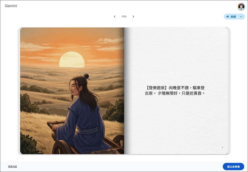 在設計時,不只可以指定繪畫風格,還能指定主角的名字、故事的標題,還可以限定頁數(最多 10 頁),也能指定每頁的內容,參考範例:製作一本 10 頁的唐詩繪本,每一頁各有一首詩,10 頁共有 10 首詩。