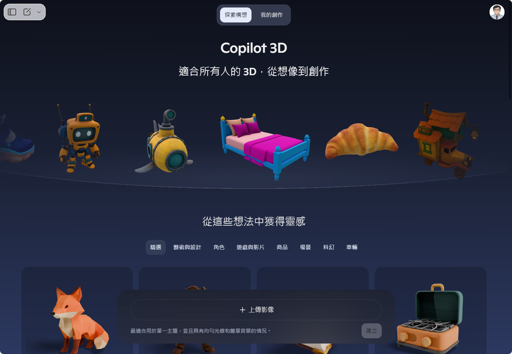 Copilot 3D 模型產生器:https://copilot.microsoft.com/labs/experiments/3d-generations