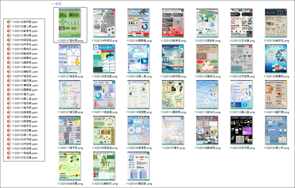 每學期的期末,我都要將全年級的必修課程產出的作品取得其 PNG 圖檔。但是因為學生都是將作品放在 PowerPoint 中,而且我只需要第一頁投影片的 PNG 圖檔。(如下圖)