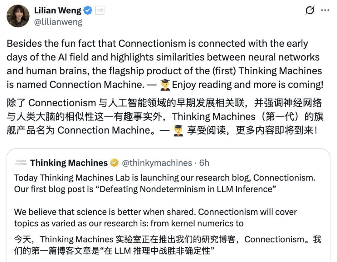 这次新研究发布后,翁荔还透露了第一个Thinking Machines产品名为Connection Machine,连接主义。