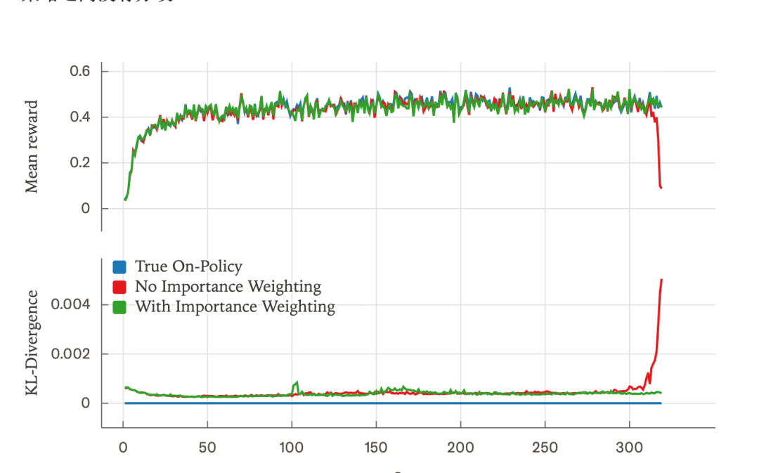 所以通过比对校正前后的数据可以发现,缺乏重要性加权校正时,模型奖励将会在训练中途崩溃,KL散度也会大幅飙升,而校正后,训练变得稳定,KL散度可以维持在0.001左右,偶有波动情况出现。