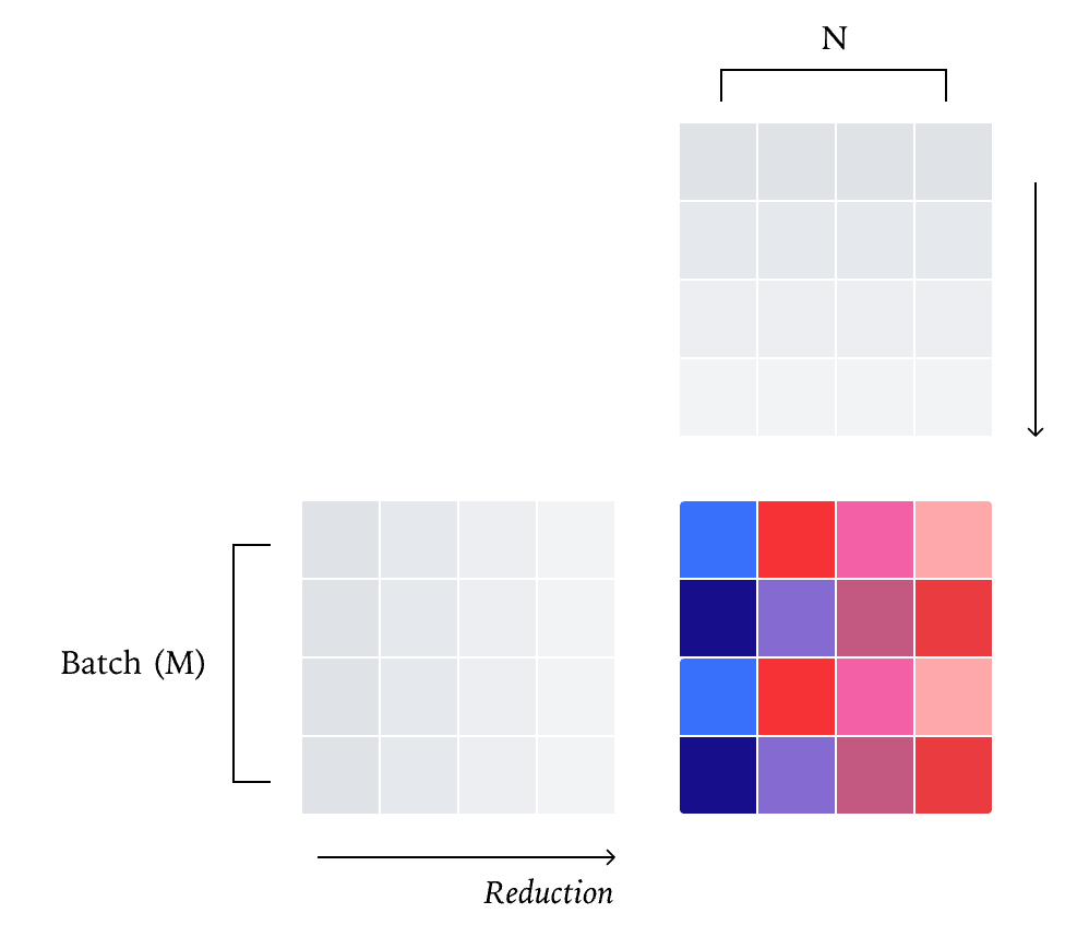 而矩阵乘法在实际中也与批大小有关,所以可以通过将输出张量拆分为2D块,然后为每个块分配不同的核心。