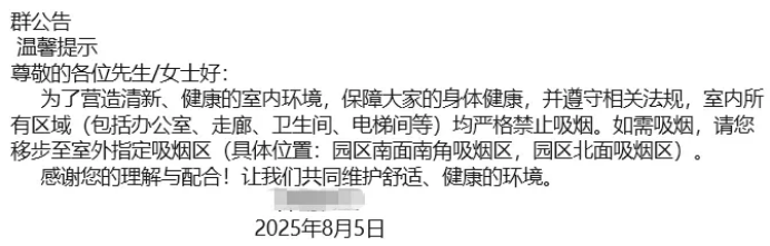 监督员来的当天,物业赶紧发通知给整栋楼的公司,只是强调“不能在走廊或洗手池窗户边抽烟”——但却对楼梯口的“吸烟区”,一字不提。